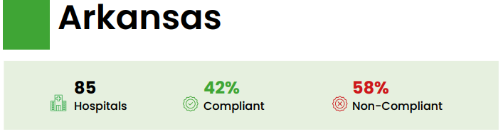 We analyzed 85 hospitals in Arkansas. Out of those, 36 (42%) hospitals are compliant, and 49 (58%) hospitals are non-compliant as per CMS price transparency guidelines. The 49 non-compliant hospitals will face a penalty of $1.25M in total.