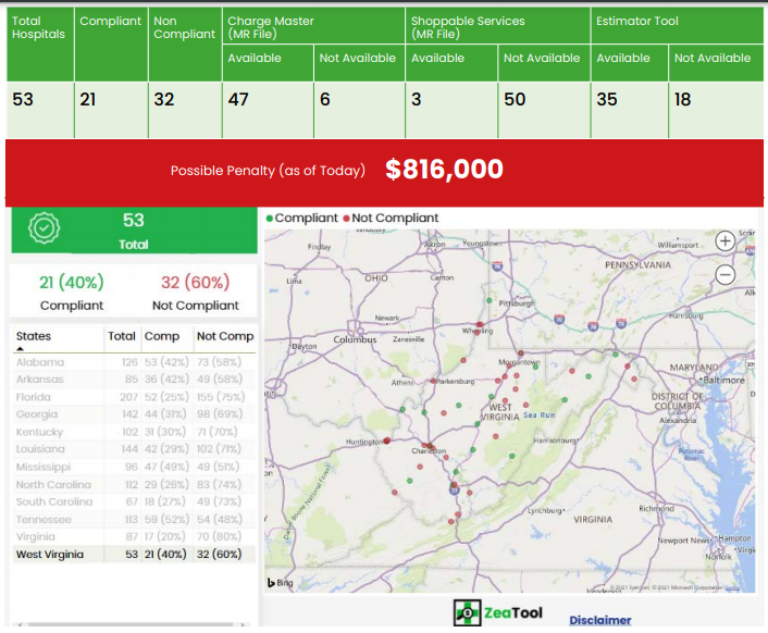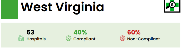 We analyzed 53 hospitals in West Virginia. 21 (40%) hospitals are compliant, and 32 (60%) hospitals are non-compliant as per CMS price transparency guidelines. The 53 non-compliant hospitals will face a penalty of $$816.00K in total.